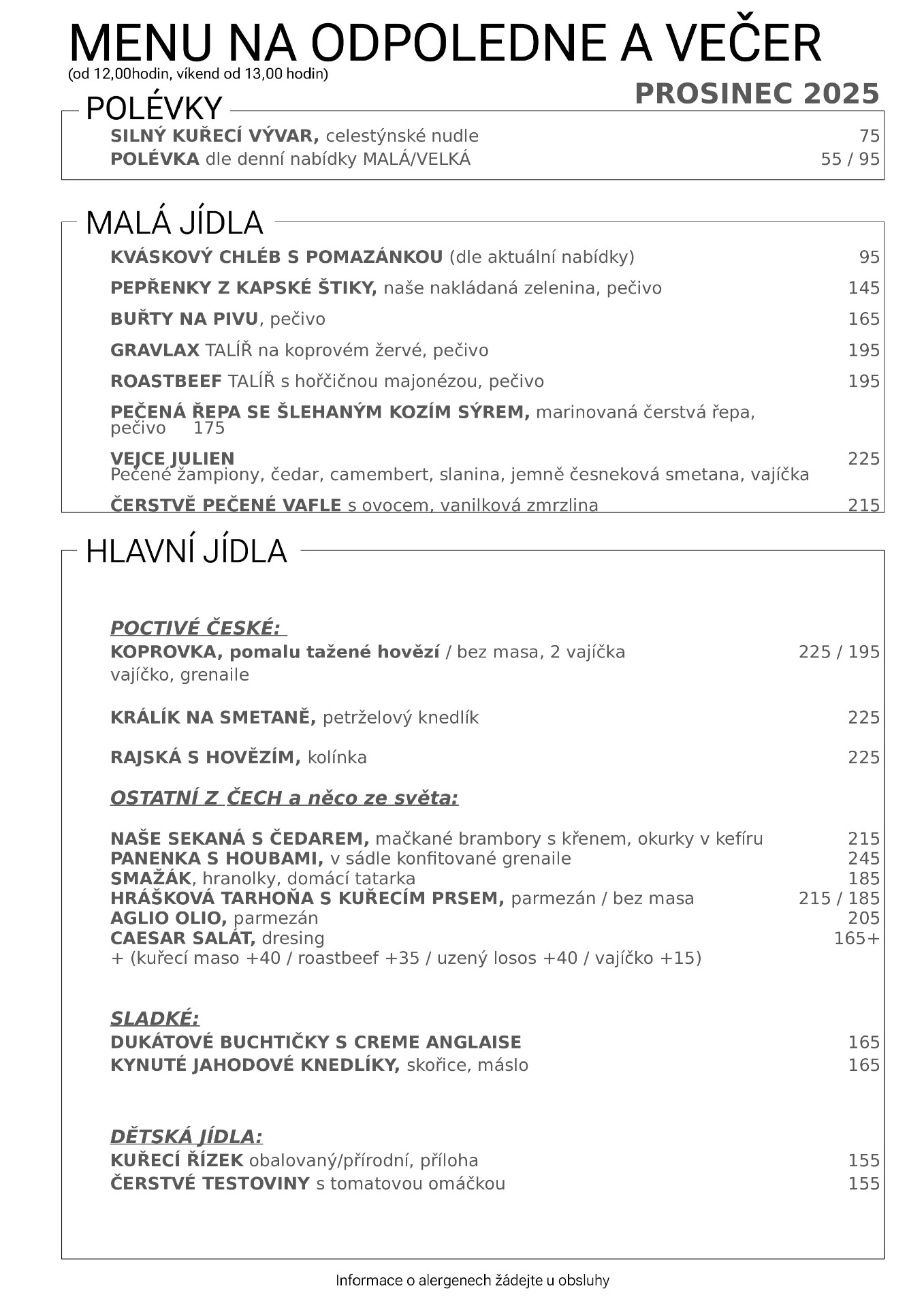 Neděle: hlavní jídla nepodáváme, pouze brunch do 13,00 hodin